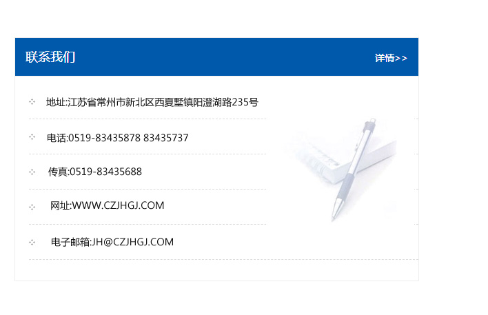 地址:常州市新北區(qū)友邦商務大廈1幢16、17層  電話:0519-85101652  傳真:0519-85112595  郵編:213022  網址:www_cz-jiayue_cn.xcxtw.com  郵箱:xiajifengaa@163.com